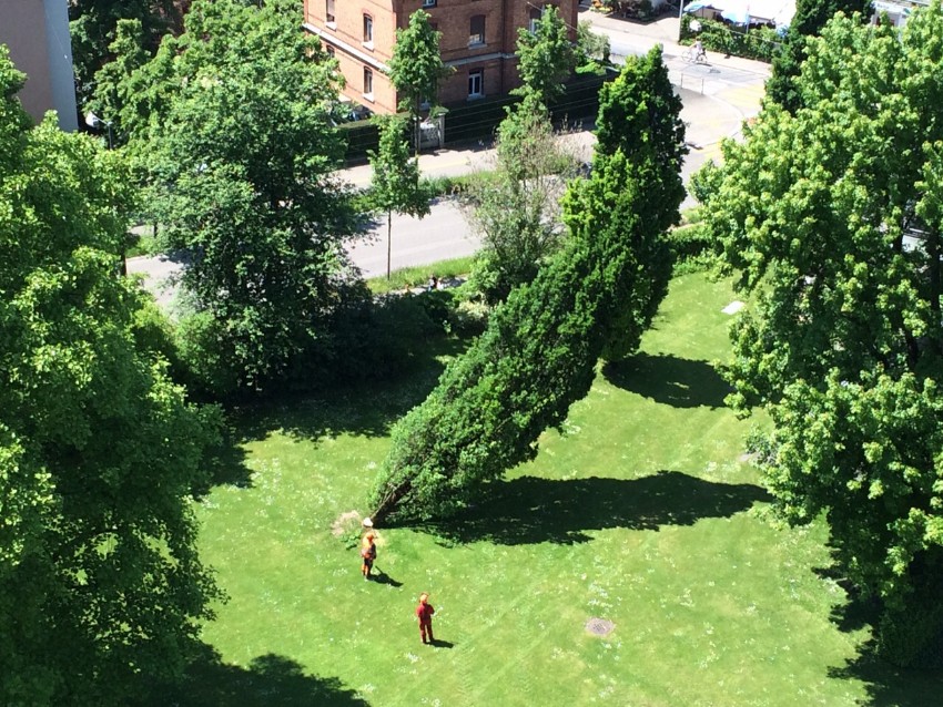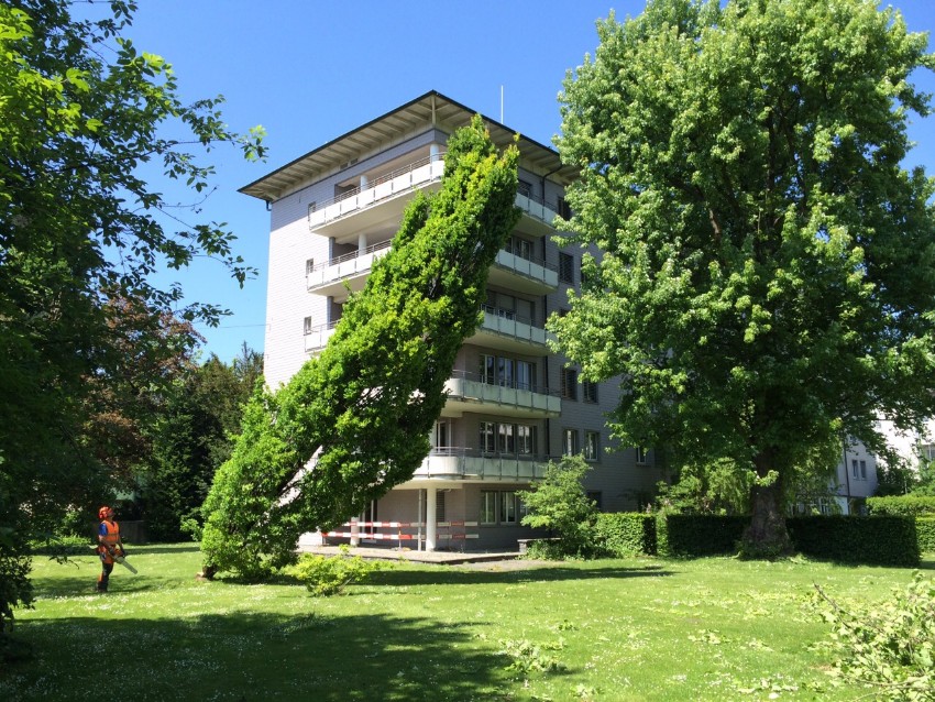 Zahlreiche alte Bäume mussten den noch laufenden Neubauten weichen. Dank der guten Zusammenarbeit mit der Bauleitung und der Aushubfirma konnte effizient und gefahrenlos gearbeitet werden. Viele Bäume konnten auf herkömmliche Art gefällt werden. Da jedoch diverse Bäume zu schützen waren, wurden zu nah stehende Bäume Stückweise gefällt. Die Arbeiten konnten zu vollster Zufriedenheit der Bauherrschaft erledigt werden.