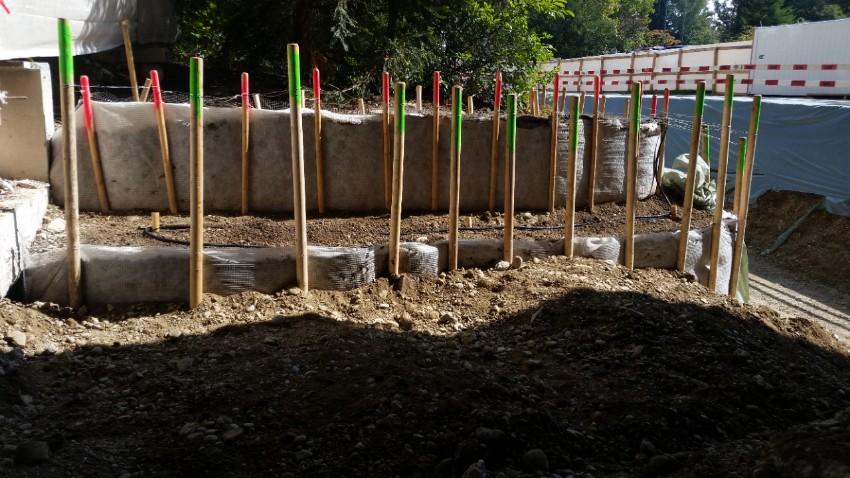 Weil der Standort der zu schützenden Bäume und deren Wurzelwerk sich mit den Aushubarbeiten kreuzte, mussten sogenannte Wurzelvorhänge erstellt werden. Der Wurzelvorhang ist eine Massnahme, um bei Abgrabungen im Wurzelbereich das Austrocknen, Beschädigen und Absterben der zu erhaltenden Wurzeln zu verhindern und die Neubildung von Wurzeln zu fördern. Das Wurzelwerk der Bäume wurde im Grabbereich feinsäuberlich freigelegt und sauber zurückgeschnitten. Entsprechend dem Wurzelverlust kann ein Kronenauslichtungsschnitt erforderlich sein.